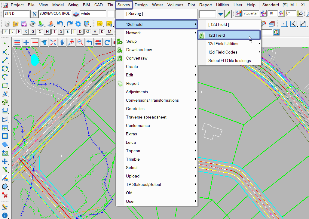 To start 12d Field use: Survey => 12d Field=> 12d Field