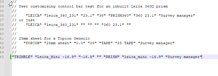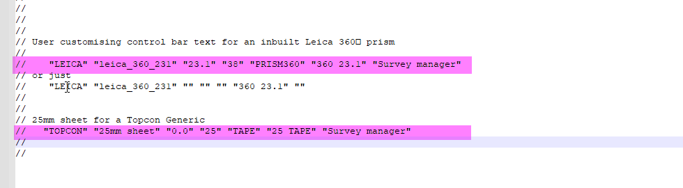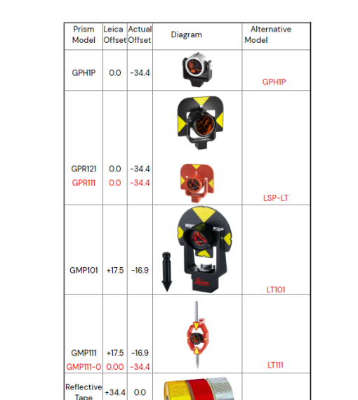 Topcon and Trimble were as their name suggests, 12df_TPS_USER_PRISMS_4d was for Leica. So why the separate files? Leica uses a different theoretical point to base its measurements from. This means a prism with a “0” constant in Leica will have an offset of -34.4 in a Trimble or Topcon. The reference manual has an image showing these difference in