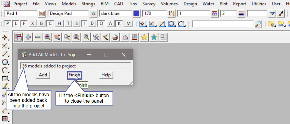 The panel displays that the models have been added back into the project. In this example there were 36 models added back into the project.