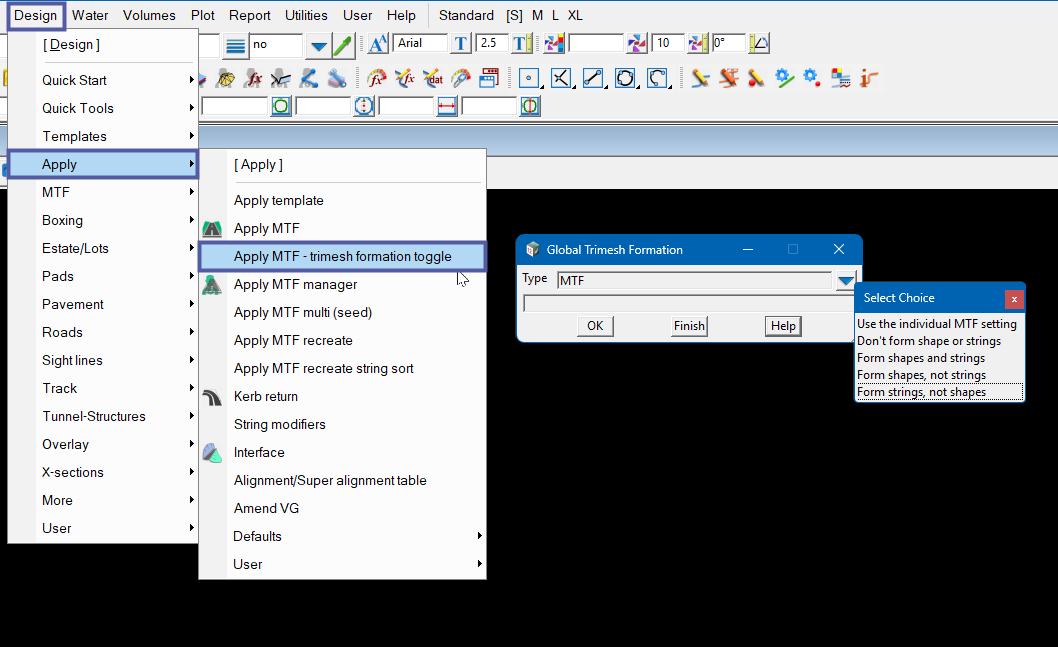 The toggle options for the Trimesh formation can be set at a Project level, so individual MTF files do net need to be opened to quickly recalculate the Design surface strings whilst still in the design process.