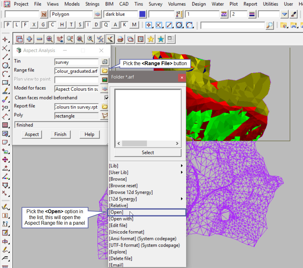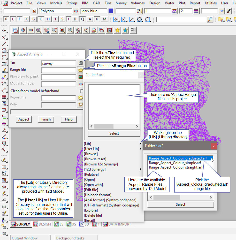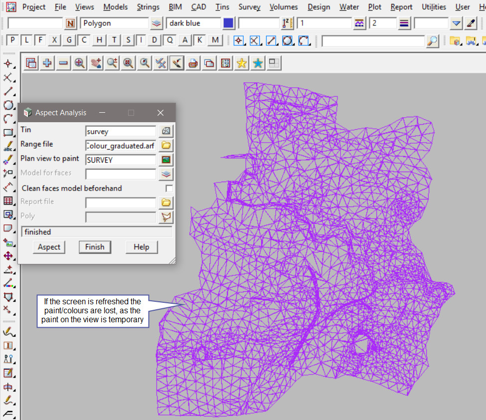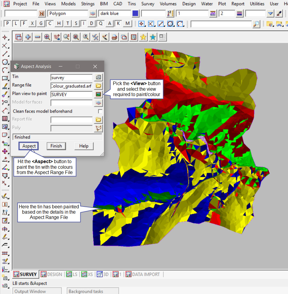 The image below is showing that the aspect range colours have disappeared from the ‘SURVEY’ view. The aspect range colours are only painted on the view, if the view is changed, ie panned, zoomed etc, the colours will disappear as they are only a temporary display.