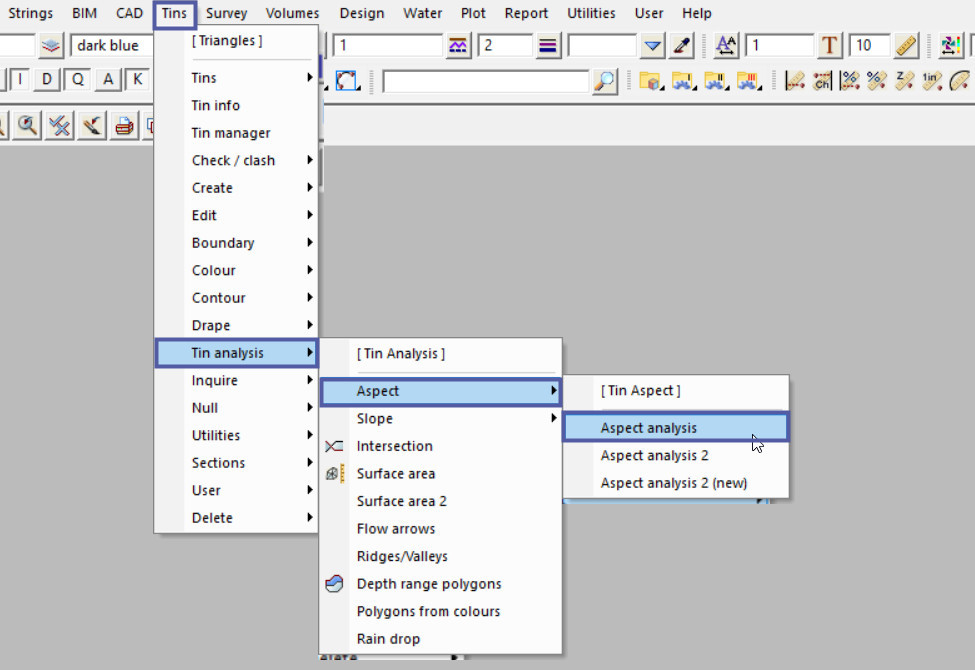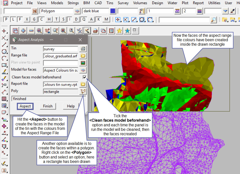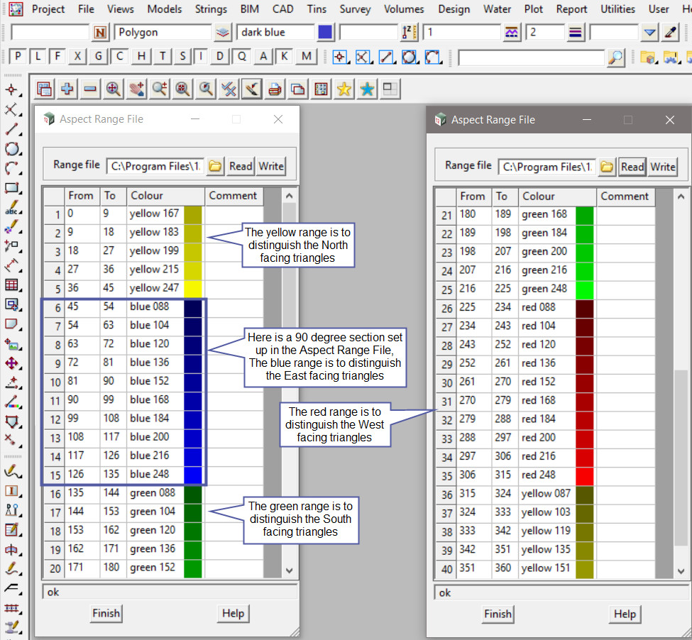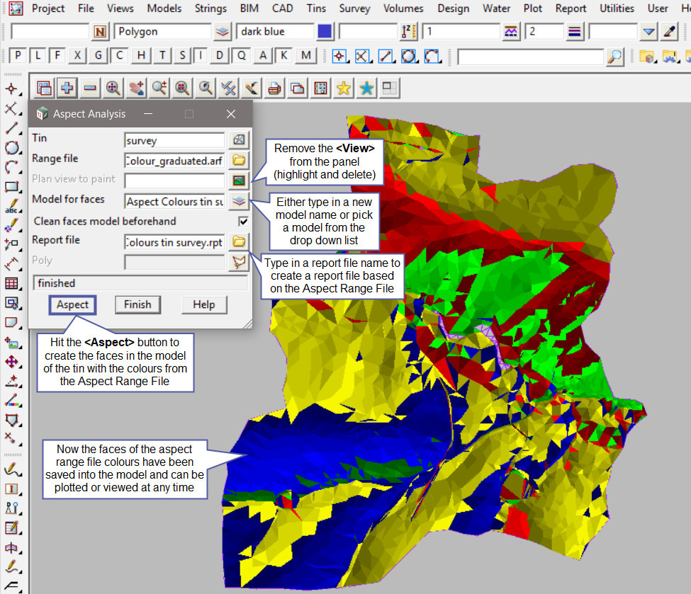 Hit the <Aspect> button and turn on the view selected (make sure you have it active) the aspect range bands will paint/colour the tin. Each different colour displayed is a graduated colour range for the 4 different directions, north, south, east and west. The colours are listed in the aspect range file.