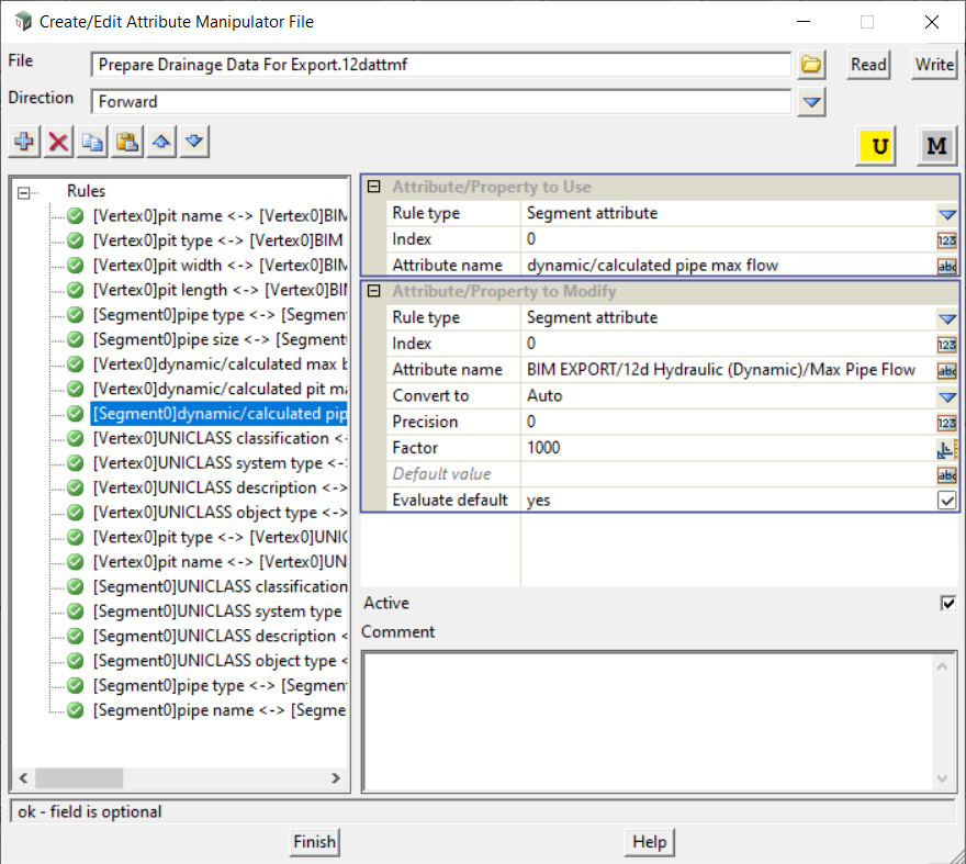 This rule will take the value of the ‘pit name’ attribute on a pipe and create a new attribute (Max Pipe Flow) in a nested structure of Attribute Groups