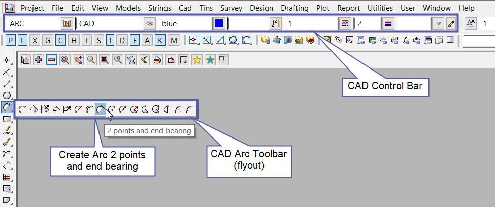 This CAD Arc 2 Points and End Bearing option is found on the CAD Arc Toolbar, and is the 8th option when the toolbar files out.