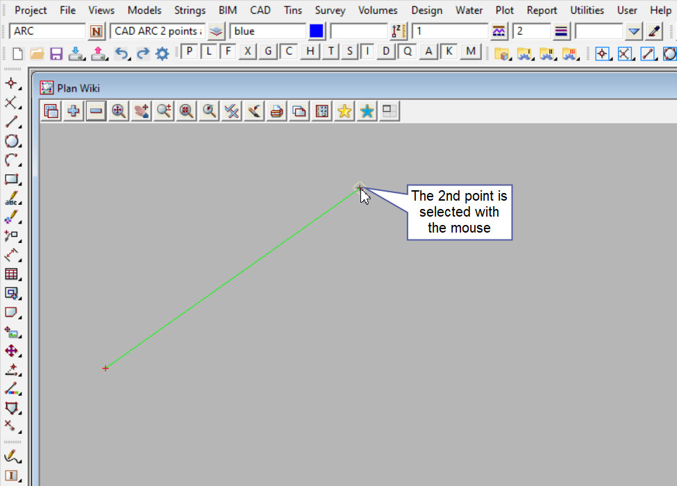 The 2nd point is selected with the mouse or entered in via the keyboard. To specify the 2nd point with the mouse, a point must be selected (Left Button) and accepted (Middle Button).