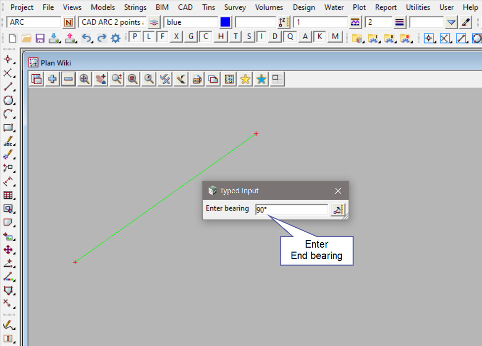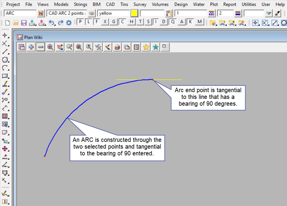 This tool is used to create a CAD Arc, using 2 points and end bearing.