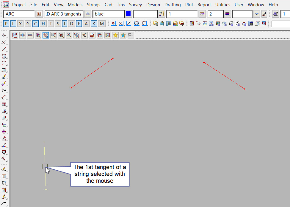 The 1st tangent segment is selected with the mouse. To specify the 1st segment with the mouse, a segment must be selected (Left Button) and accepted (Middle Button).