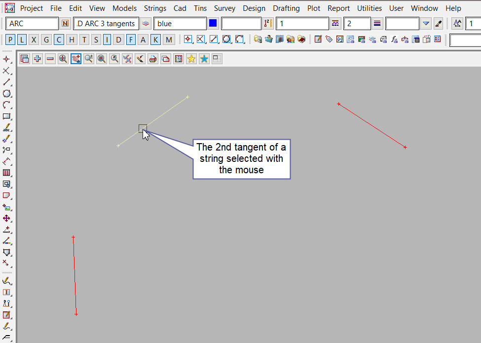 The 2nd tangent segment is selected with the mouse. To specify the 2nd segment with the mouse, a segment must be selected (Left Button) and accepted (Middle Button).