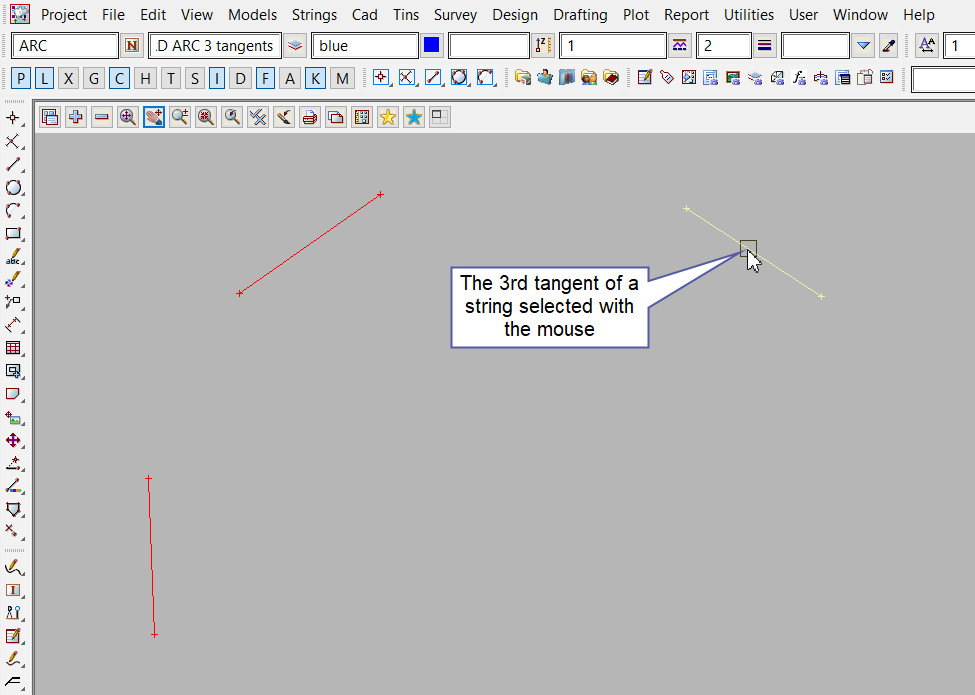 The 3rd tangent segment is selected with the mouse. To specify the 3rd segment with the mouse, a segment must be selected (Left Button) and accepted (Middle Button).