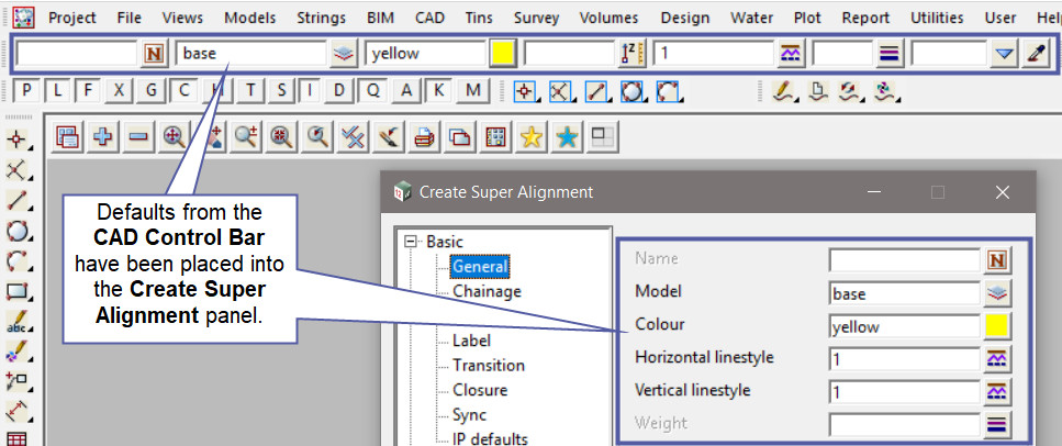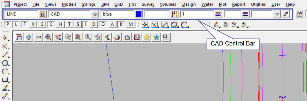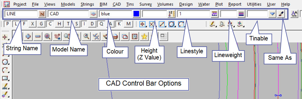 The CAD Control Bar is found at the top of 12d Model program and is always active. It allows users to set defaults for creating new strings/data, especially if creating a large amount of data.