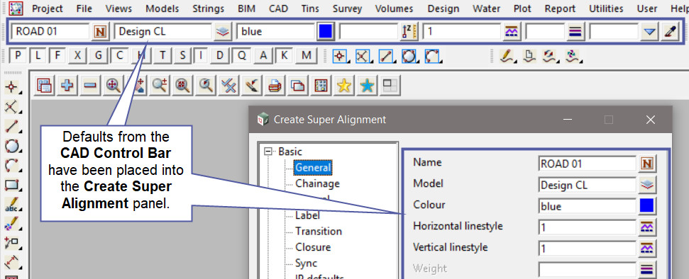 The defaults from the CAD Control Bar are also loaded into panels where data is created, below is an example where the CAD Control Bar defaults were loaded into the Create Super Alignment panel, the second screen capture shows how much easier it is to have the defaults loaded into the CAD Control Bar when creating many Super Alignments.