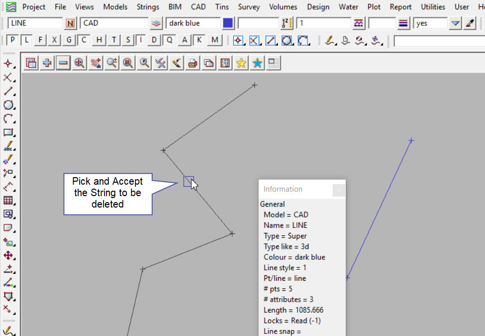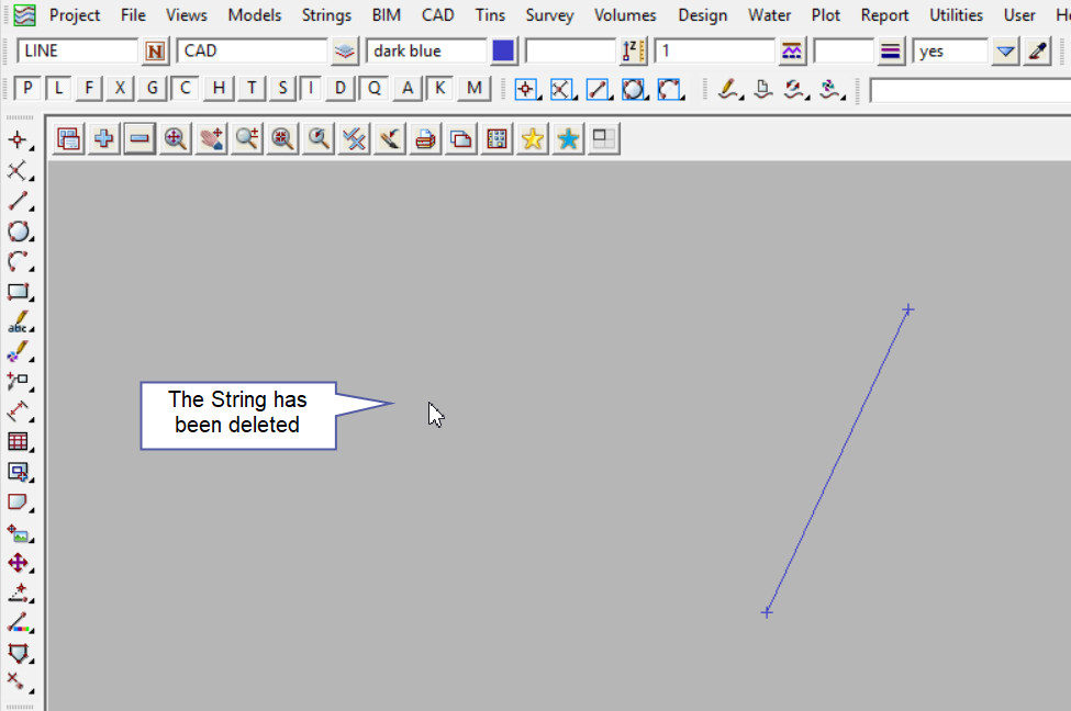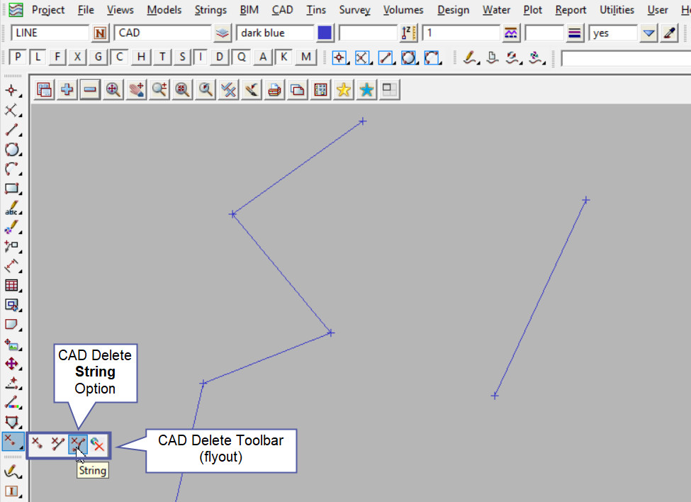 The CAD Delete String option is found in the CAD Delete Toolbar, and is the 3rd option when the toolbar flies out.