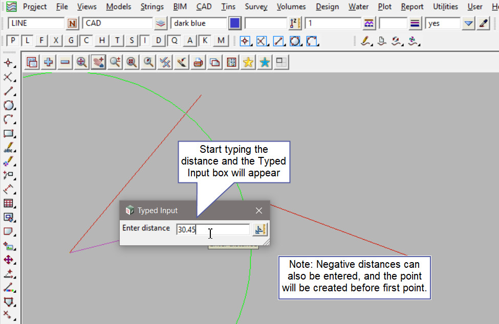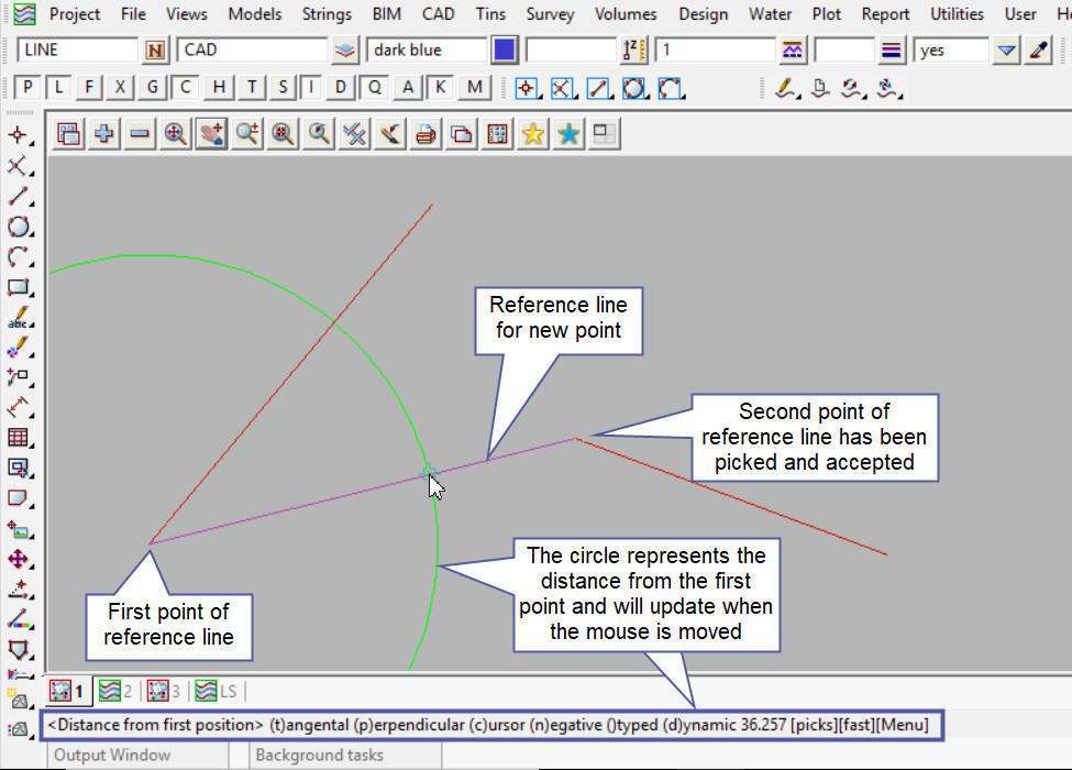 This tool is used to create a CAD Point, located on the line between 2 positions and a given distance from position one.