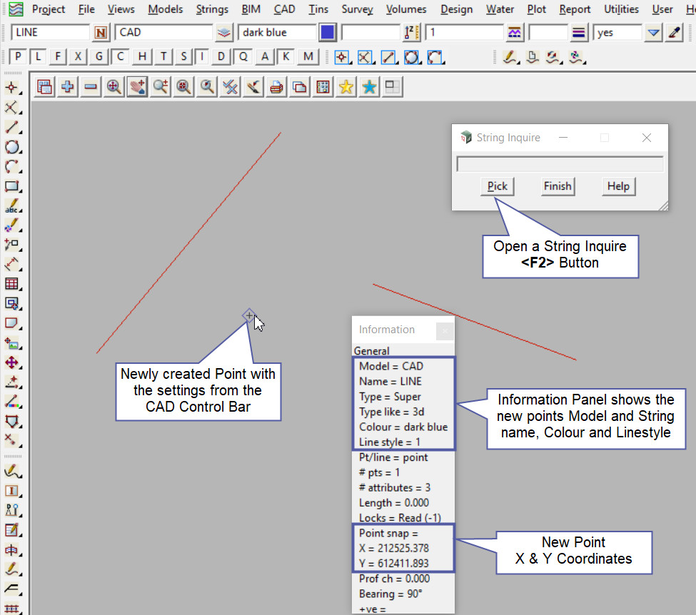 The Point is created and placed using the details from the CAD Control Bar, these include,