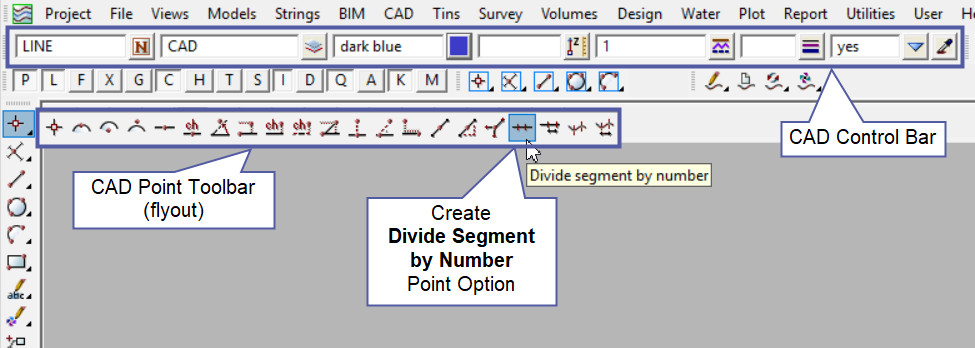 This CAD Point Divide Segment by Number option is found on the CAD Point Toolbar, and is the 18th option when the toolbar files out.