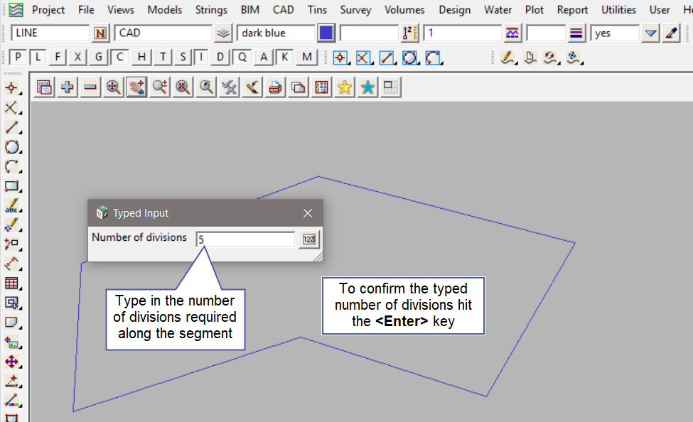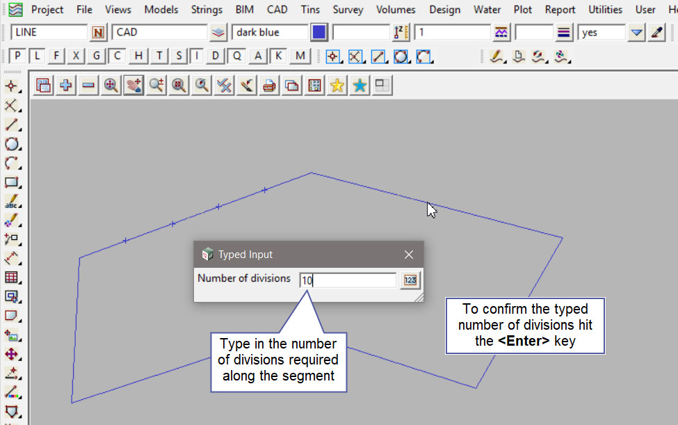 After the segment of the string is selected, 12d Model will prompt the user to enter the number of divisions into the panel. Hit the <Enter> key to confirm the number of divisions.