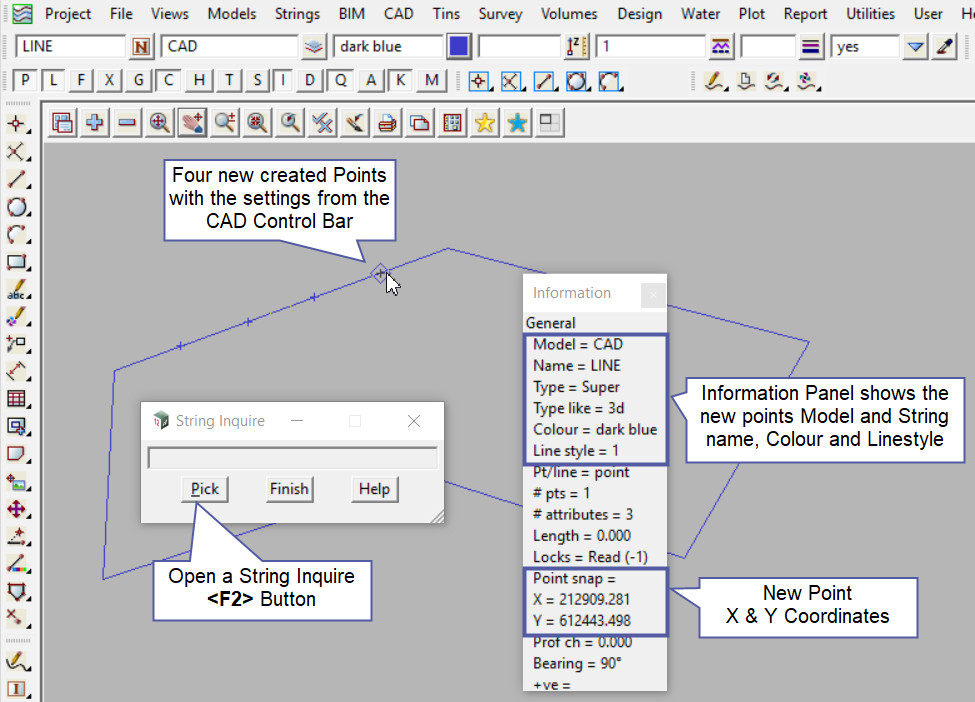 The Point is created and placed using the details from the CAD Control Bar, these include,