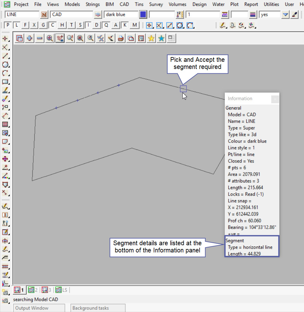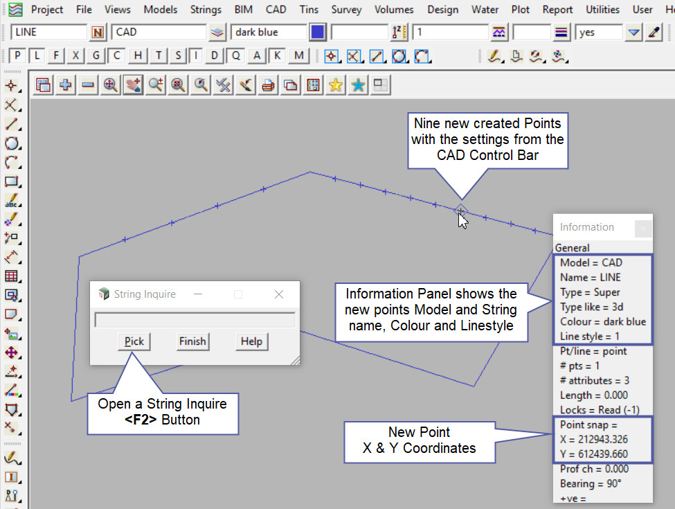 Note: The Points that are created with this option as described in the examples below are single point strings not associated with the string or segment that was selected. There is an option inside 12d Model that will segment the string and the points will be created on the selected string.