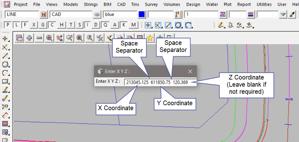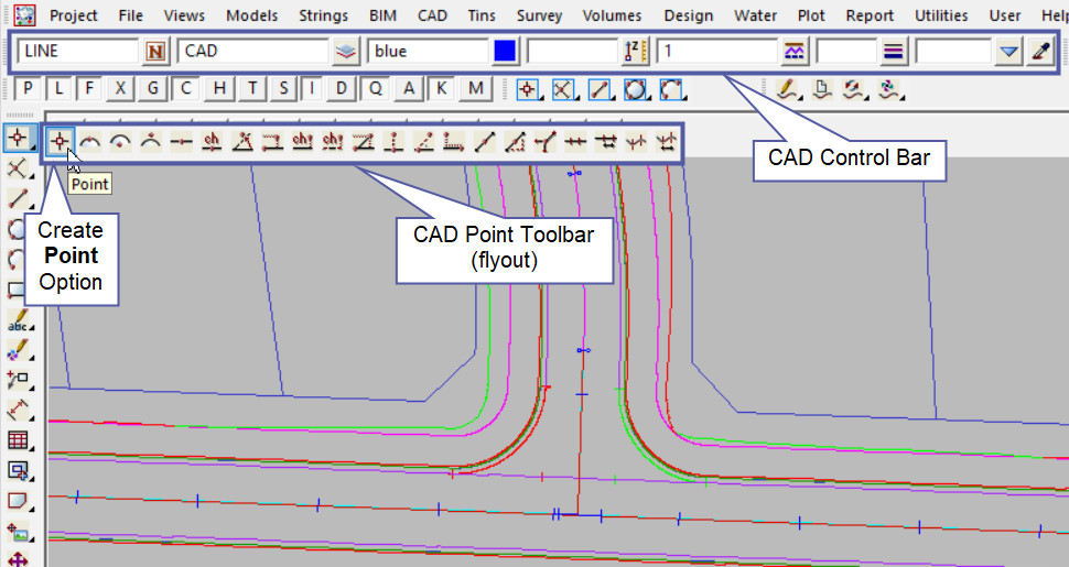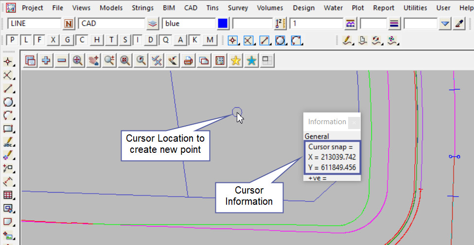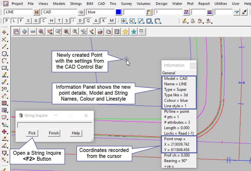 The Point is created and placed using the details from the CAD Control Bar, these include, String Name, Model, Colour, Z – Value, Linestyle, Weight and Tinable.