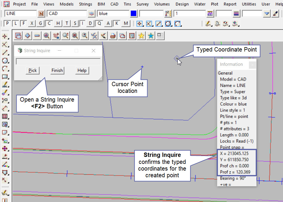 Once the coordinates are entered into the panel, hit the <Enter> key on the keyboard to create the point. Use a String Inquire to check the point details.
