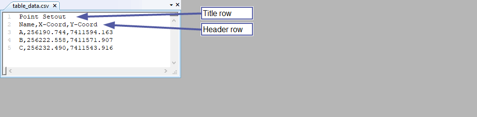 "Point Setout",,, "Name","XCoord","YCoord","Radius" "A","256190.744","7411594.163","5" "B","256222.558","7411571.907","10" "C","256232.490","7411543.916","8" "D","256260.480","7411536.919","12" "E","256270.927","7411493.013","5"