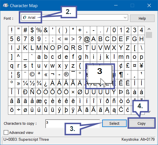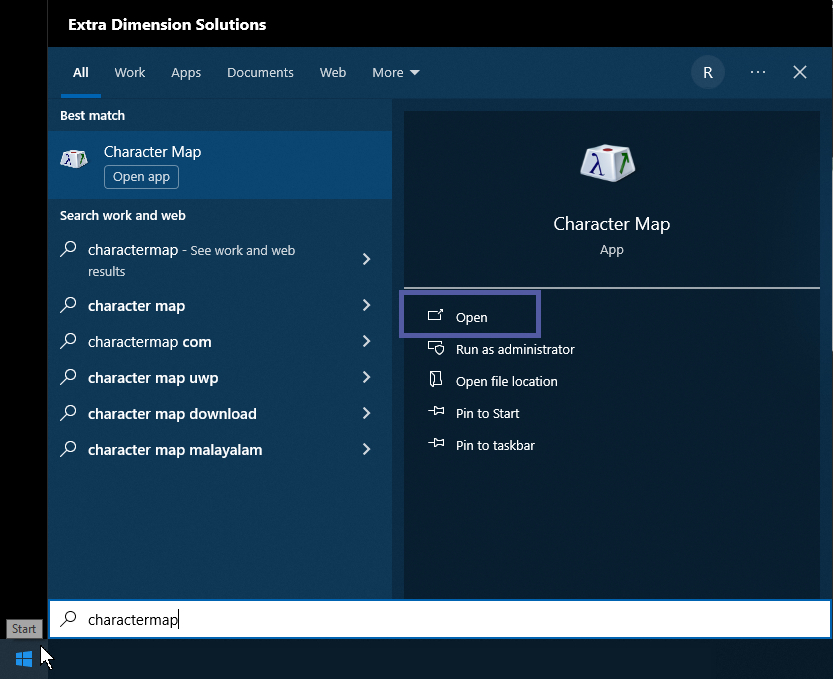 1. Move your cursor down to the computer “Start” button (typically bottom left) and click on this to provide a list of all the programs loaded on your PC. Start typing “Character Map” and open the installed software as shown below.