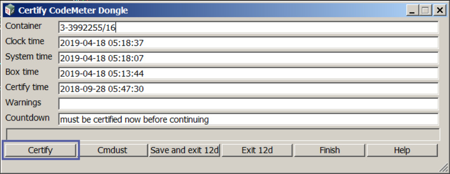 If the date on the dongle is too old (more than 2 months) then 12d Model will start, but soon after starting will display the ‘Certify Codemeter Dongle’ panel above.