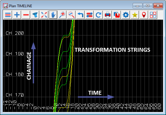 The Chainage Timeline follows a string or path by querying another string that defines what chainage (Y-Value) the object should be at for any given time (X-Value).  It is easiest to think of a Chainage Timeline as a graph that plots X=Time v’s Y=Chainage.