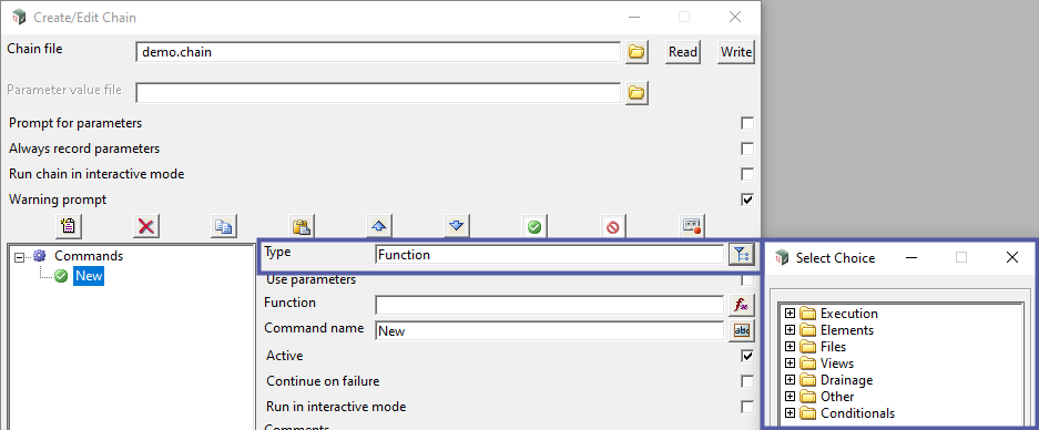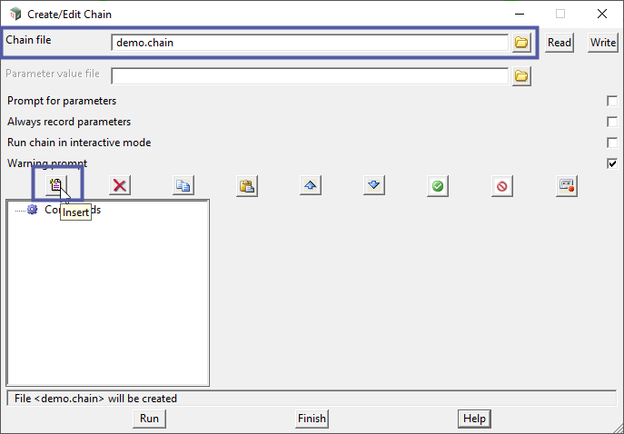 On the Create/Edit Chain panel, enter a Chain File name and then use the Insert button to add a new command.