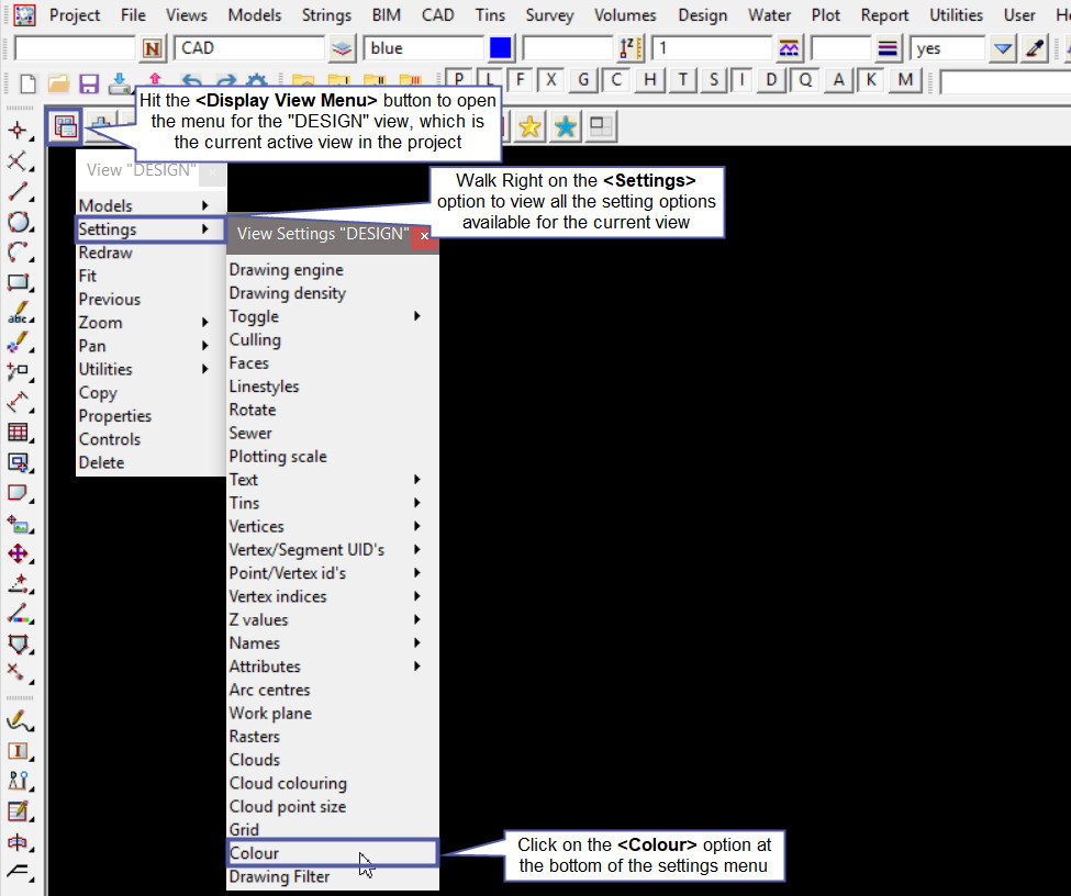 To change the background colour of a view it is hidden in the <Display View Menu> button, which is located at on the “View Toolbar”. If you would like to learn more about the View Toolbar options,