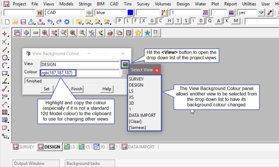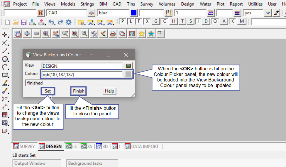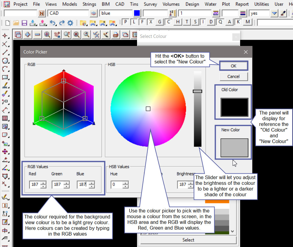 In this example the RGB colour, (rgb 187,187,187) has been loaded into the View Background Colour panel.