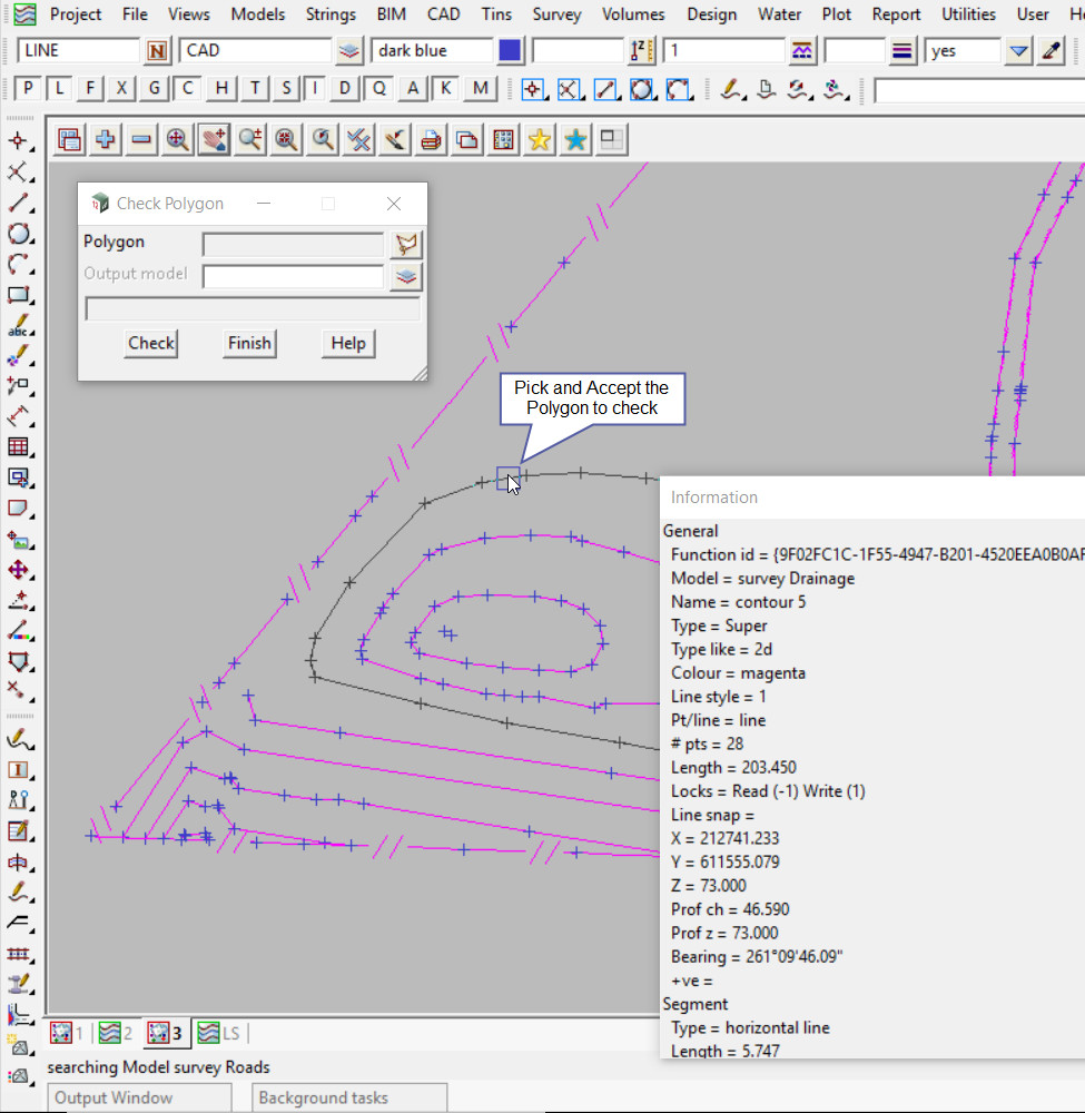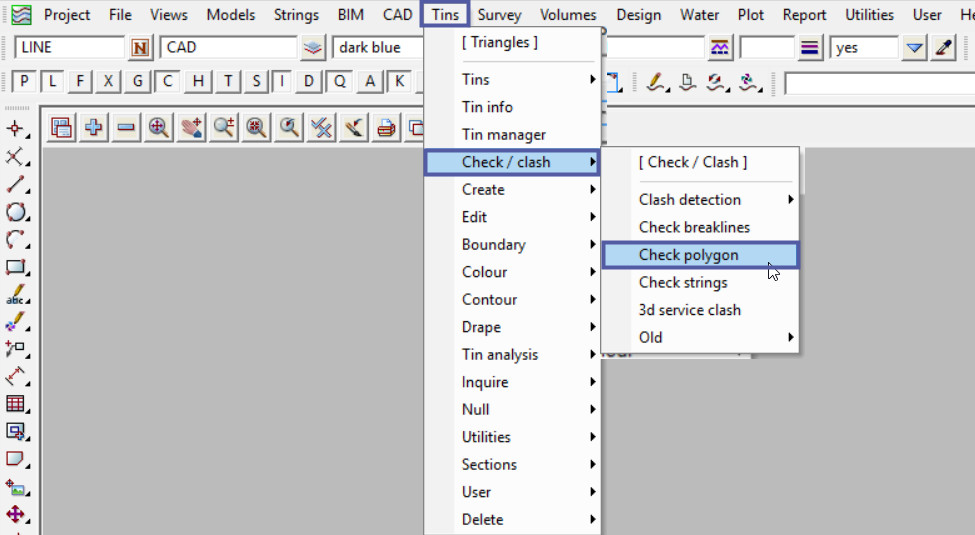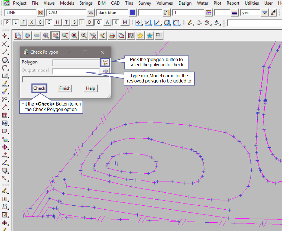 To view the Check Polygon Panel, Use: Tins => Check/Clash => Check Polygon