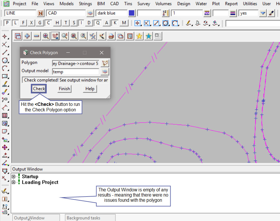 Hover over the output window to see if any results are displayed. In this example there are no issues found with the polygon as the output window is empty.