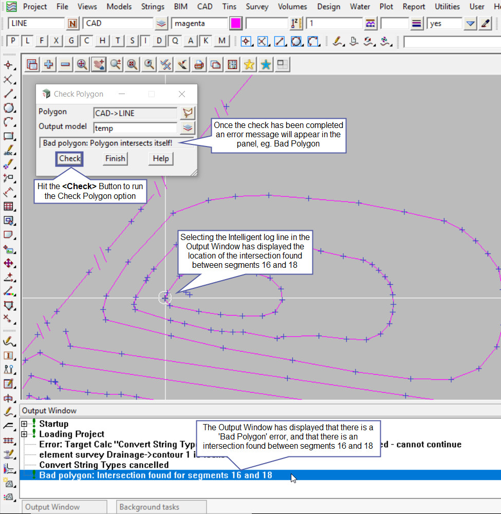 Hover over the output window to see the error results displayed. In this example the polygon intersects with itself at segments 16 and 18. Select the error message in the output window and 12d Model will place the cursor location of the intersection – allowing the error to be found quickly.
