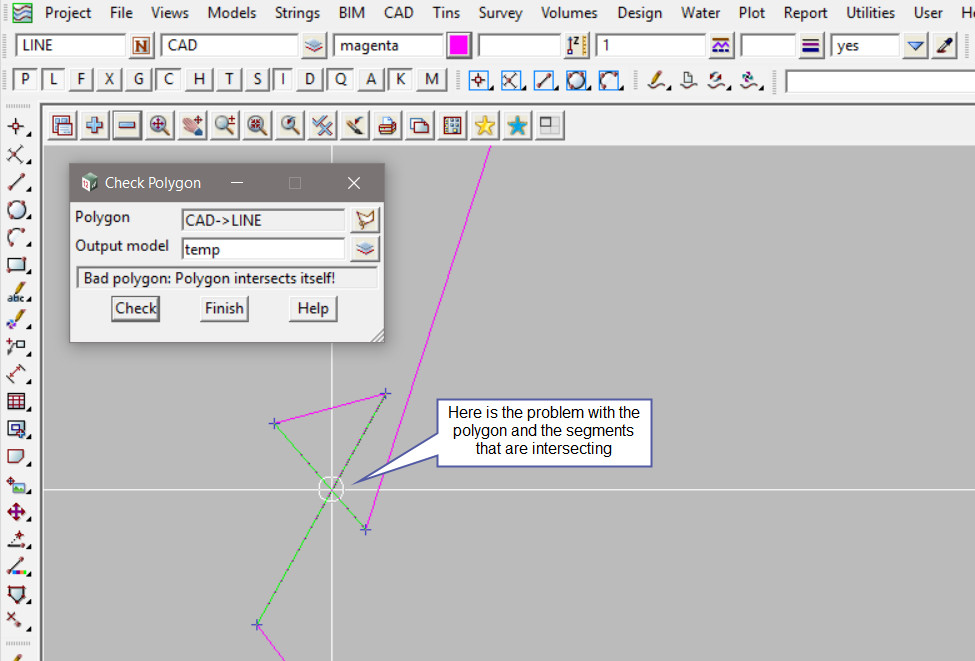 This Polygon check option will test to ensure that the polygon is a simple (or Jordan) polygon which is needed within some 12d Model options. For example polygons that crosses over itself, or has duplicate vertices, or has edges partially on top of other edges, or in parts consists of a single line, are not usable in most options requiring a polygon (fence) for calculations.
