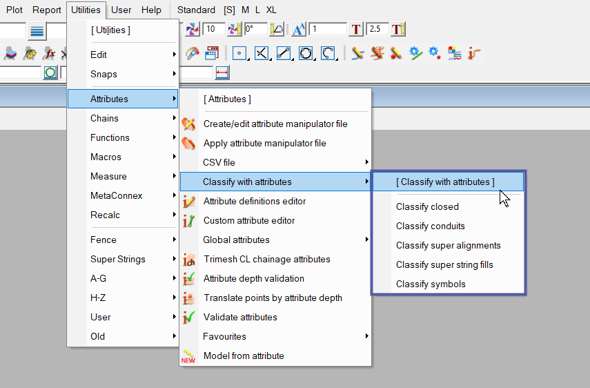 The example might be the selection of all the “closed” strings within a group of models. The standard 12d “data selection method” doesn’t contain such a tool for this, but if the user classifys the project data first. An attribute will then be produced which can be used (within the filter option) for just such a selection of that specific data.