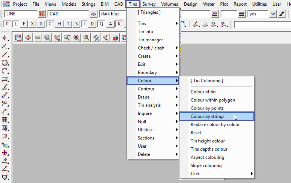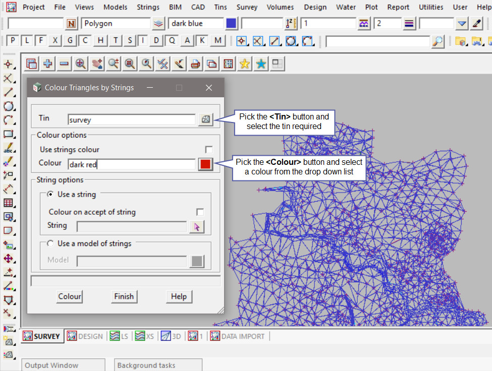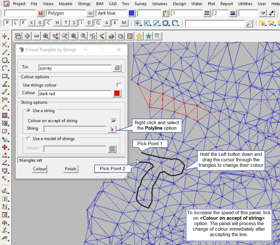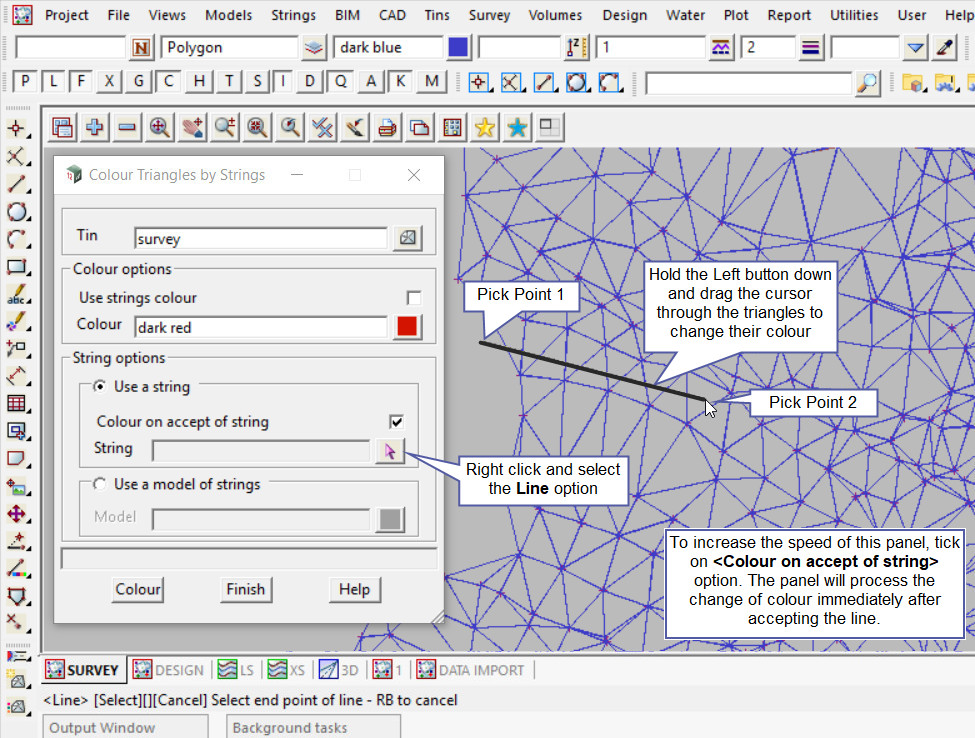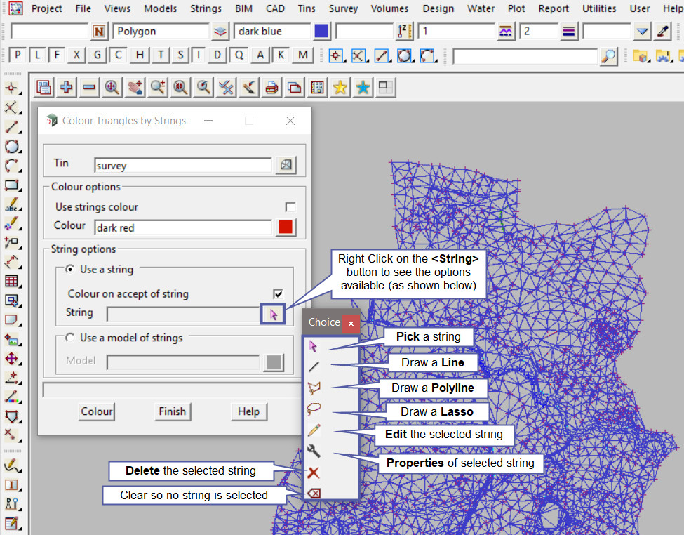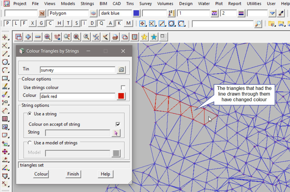 Right click on the <String> button and select the ‘Line’ option. Pick Point 1 and drag the cursor over the triangles that are to have their colour changed.