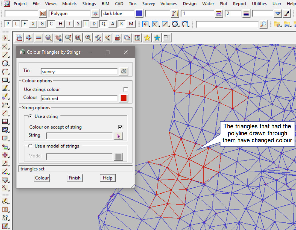 Below shows that the triangles that had the polyline drawn through them have had their colour changed.
