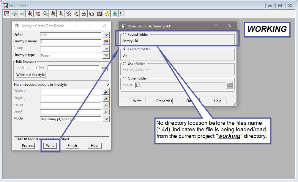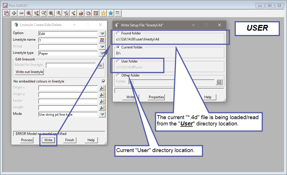 Note: No other versions (copies) of the linestyl.4d file matter except for the one in the Working folder. - The ‘User‘ folder is the folder where you (the user) put your configuration files.