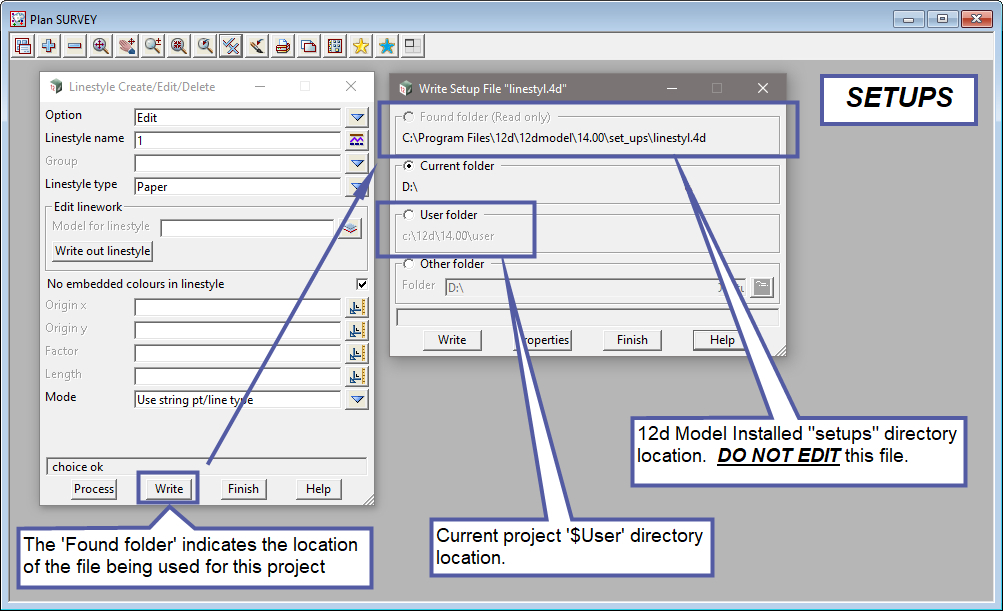 The Setups folder is ‘C:\Program Files\12d\12.00\setups’. Files in this folder are read only.