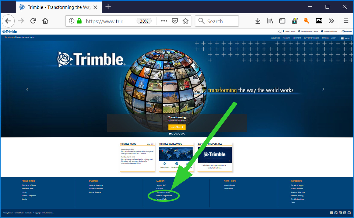 Browse to the Trimble website www.trimble.com and find the ‘Product Registration’ link at the bottom of the main page