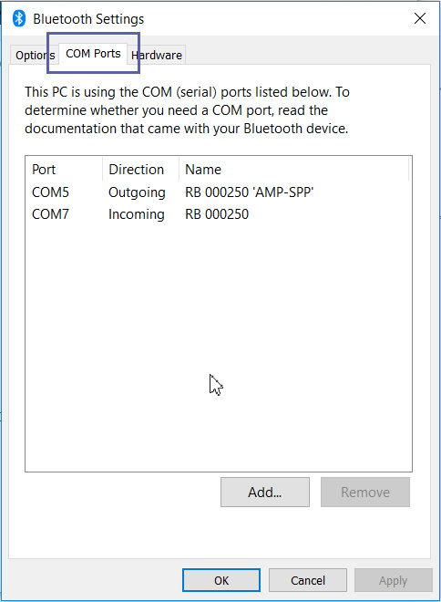 If you have chosen a com port option, you need to find which ‘port’ windows has assigned to this Bluetooth connection.