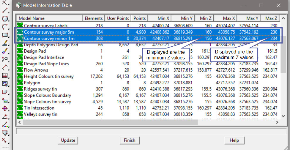 Here the minimum and maximum Z values are displayed for the contour strings.