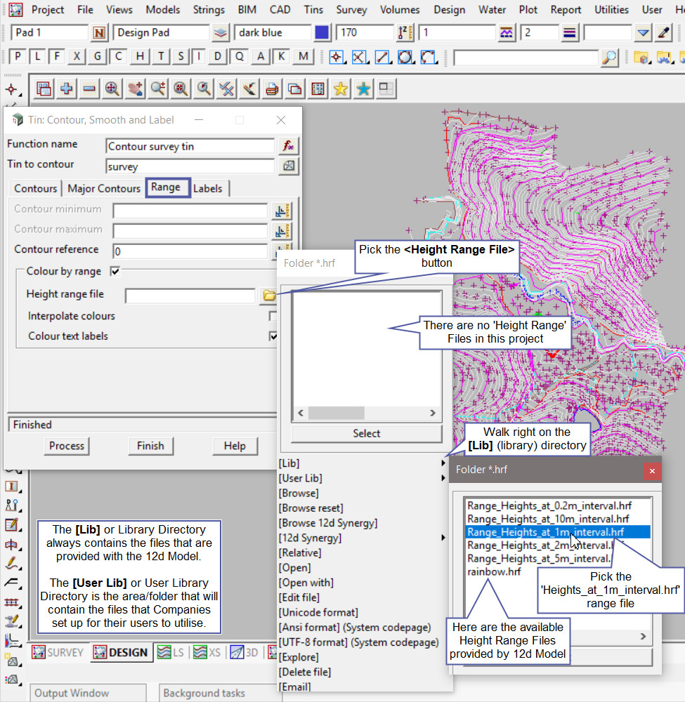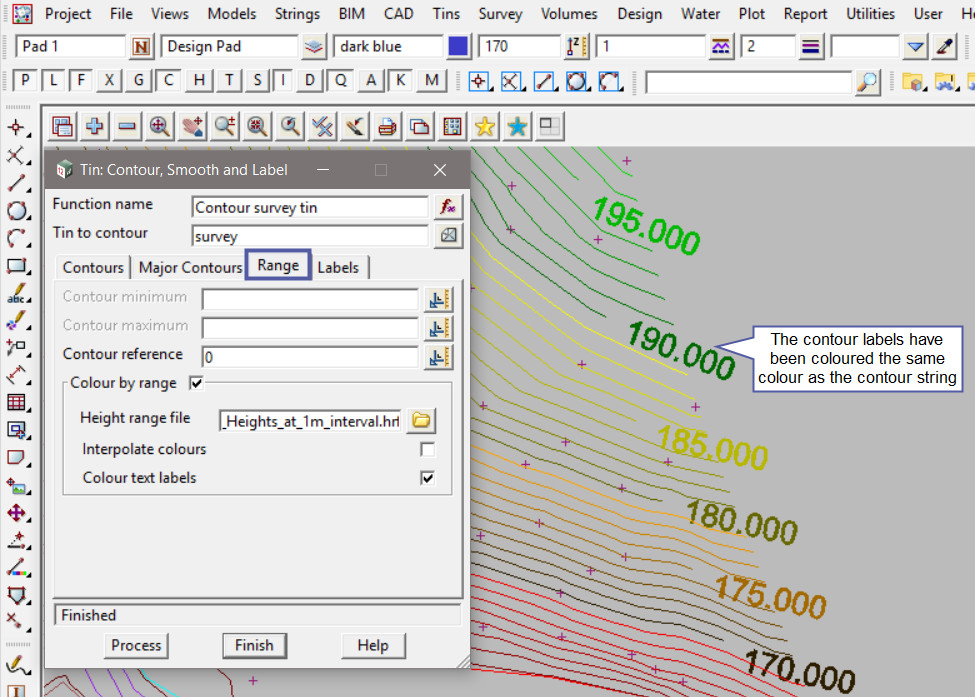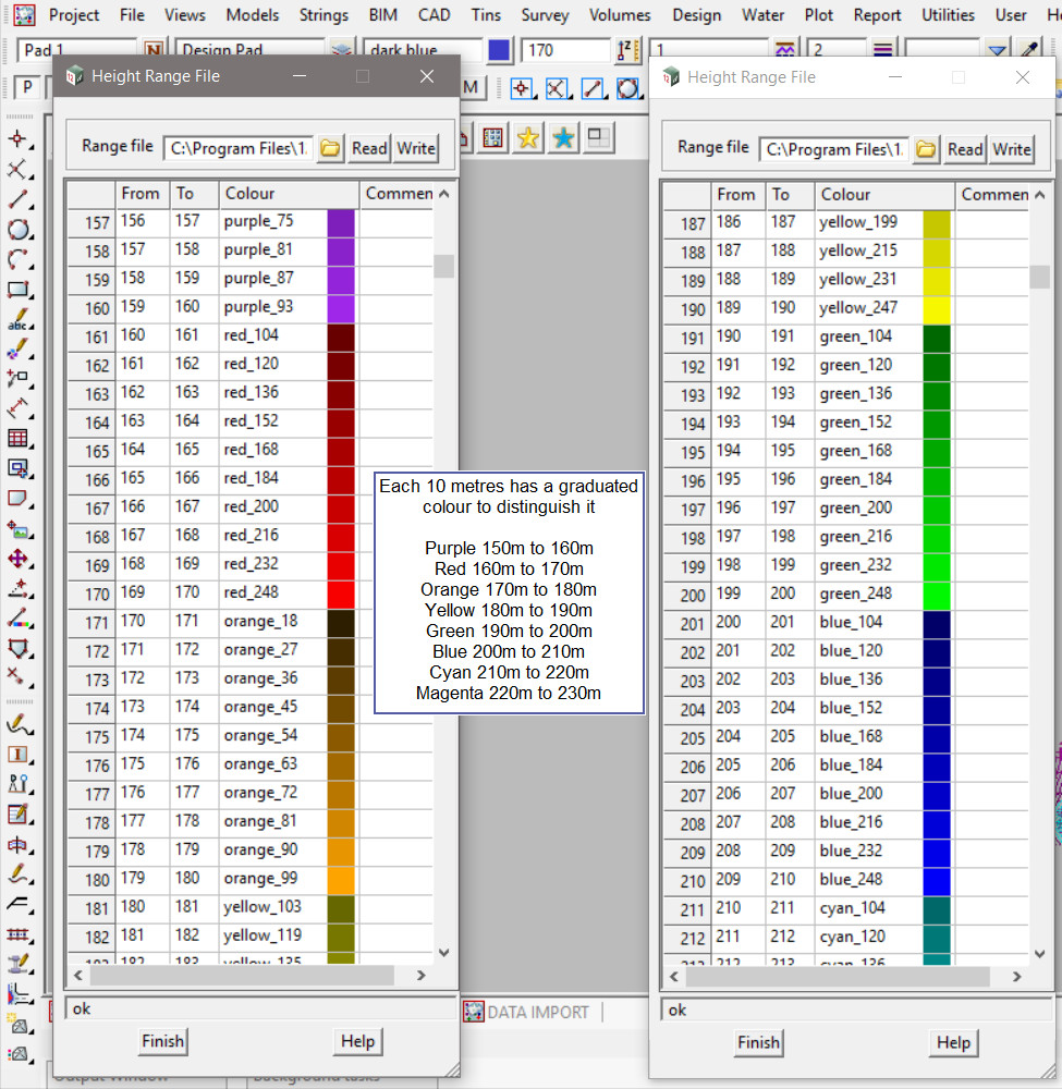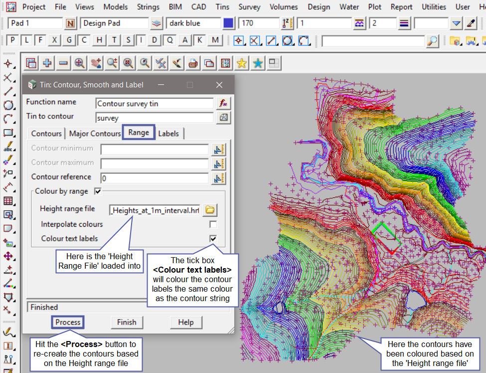 Hit the <Process> button and see that the Height range bands will colour the contour strings. Each different colour displayed is a graduated colour range for every 10 metres of height. The colours are listed in the height range file.