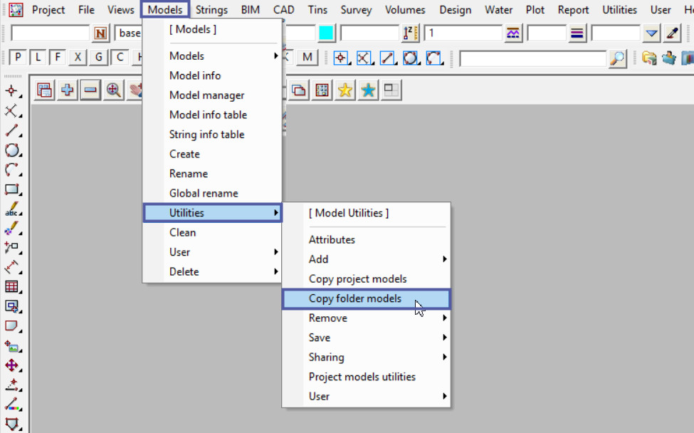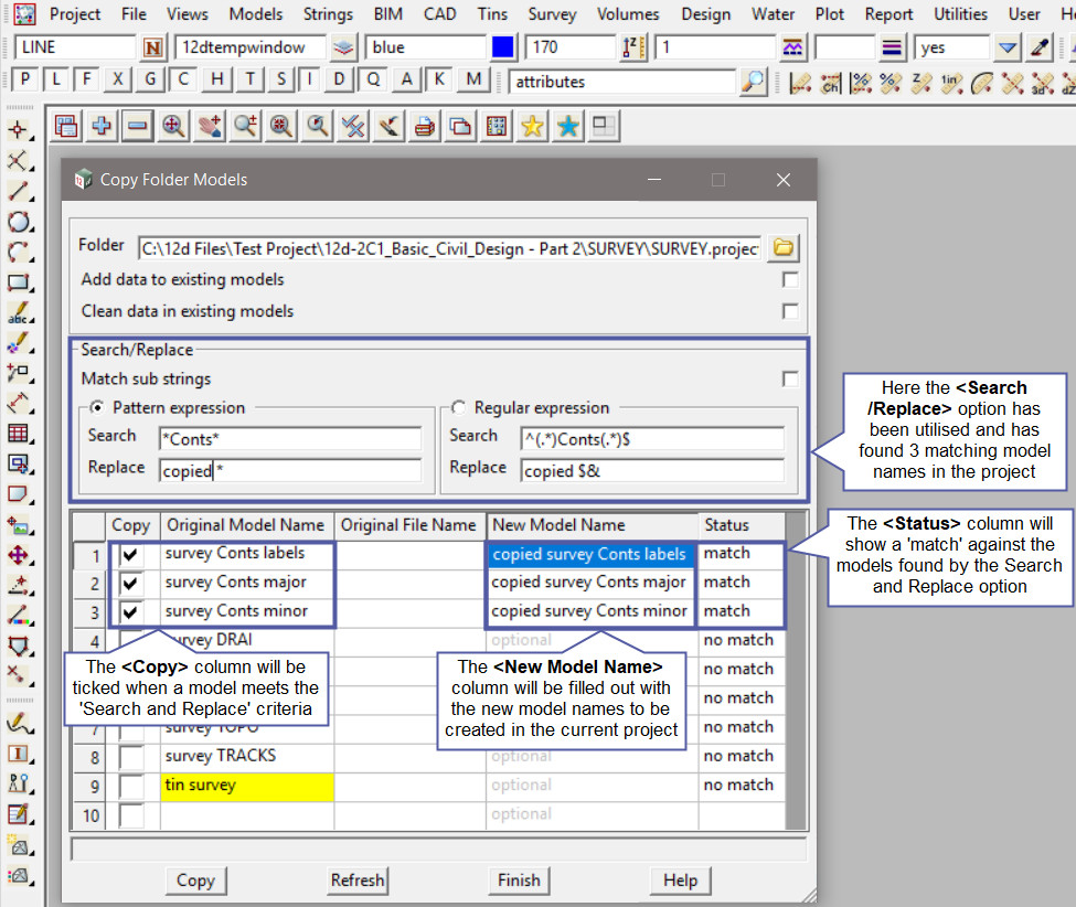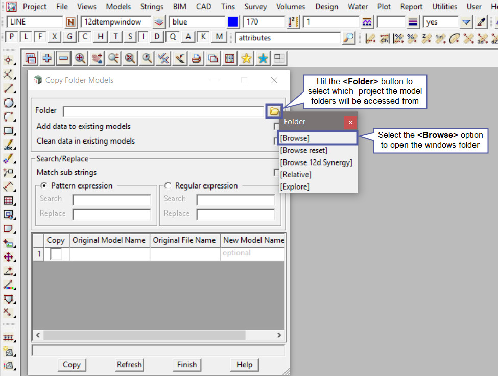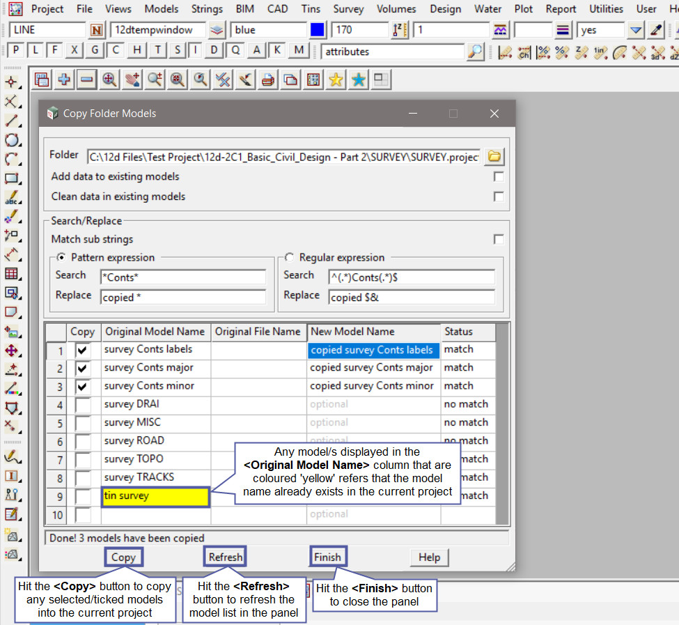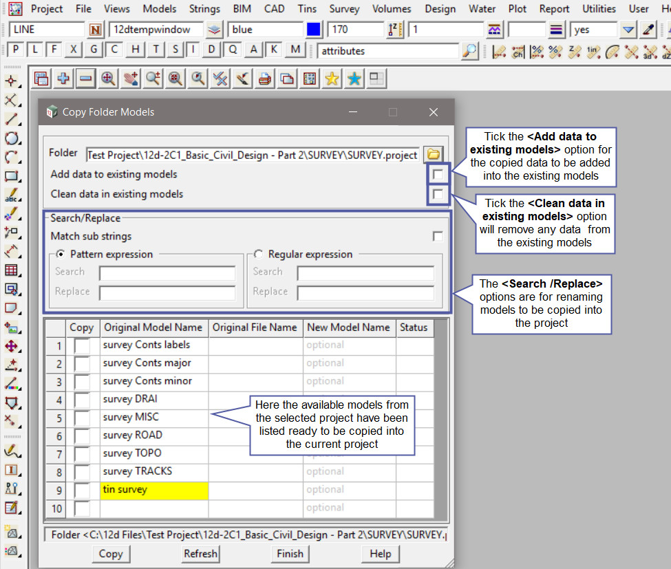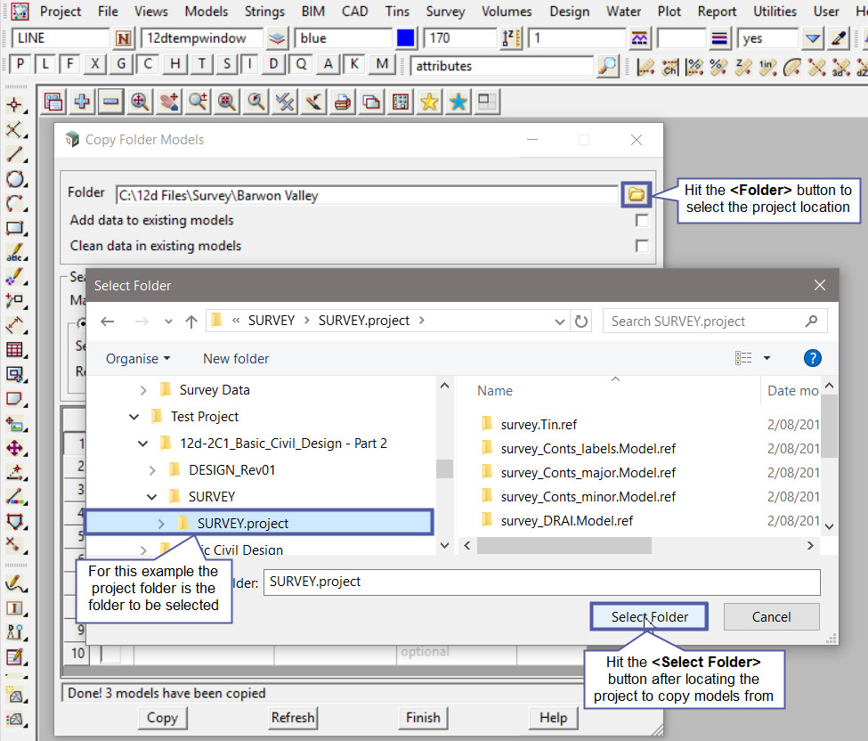 This option is used to copy models from a specified folder into the project, including 12d Synergy Folders.