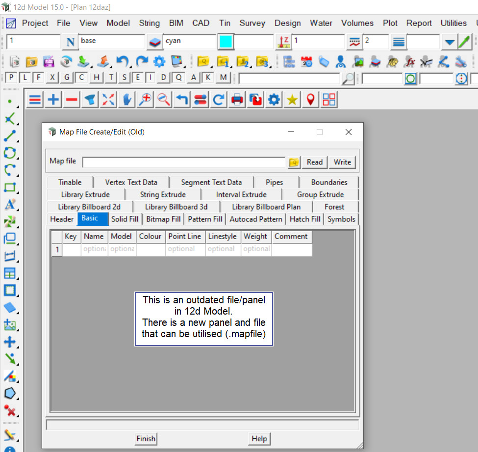 This panel has become outdated in 12d Model, it can still be used to create or edit the old .mf file types, however the new file type .mapfile is the one to use.