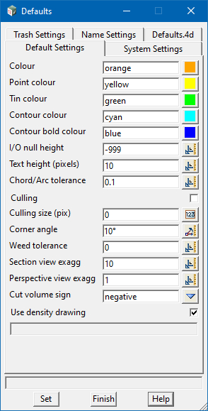 The “Defaults” panel has been superseded by “Project Settings” option which includes values for the project from not only from the old Defaults file but also contains additional settings from other 12d panels.