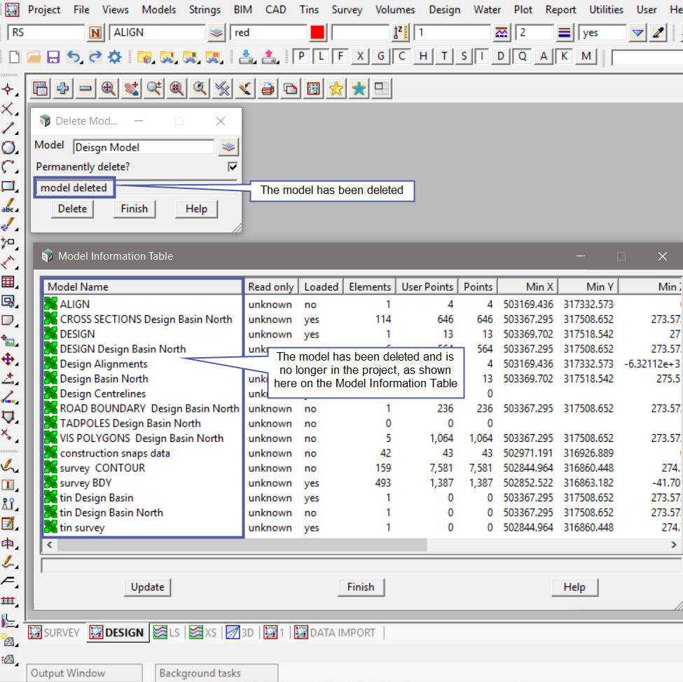 After the model is deleted from the project, use the ‘Model Information Table’ to check that the model is no longer in the project. Use: Models => Model Information Table