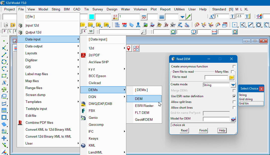 To read in a DEM file, go to: File => Data Input => DEM => DEM