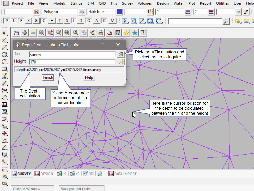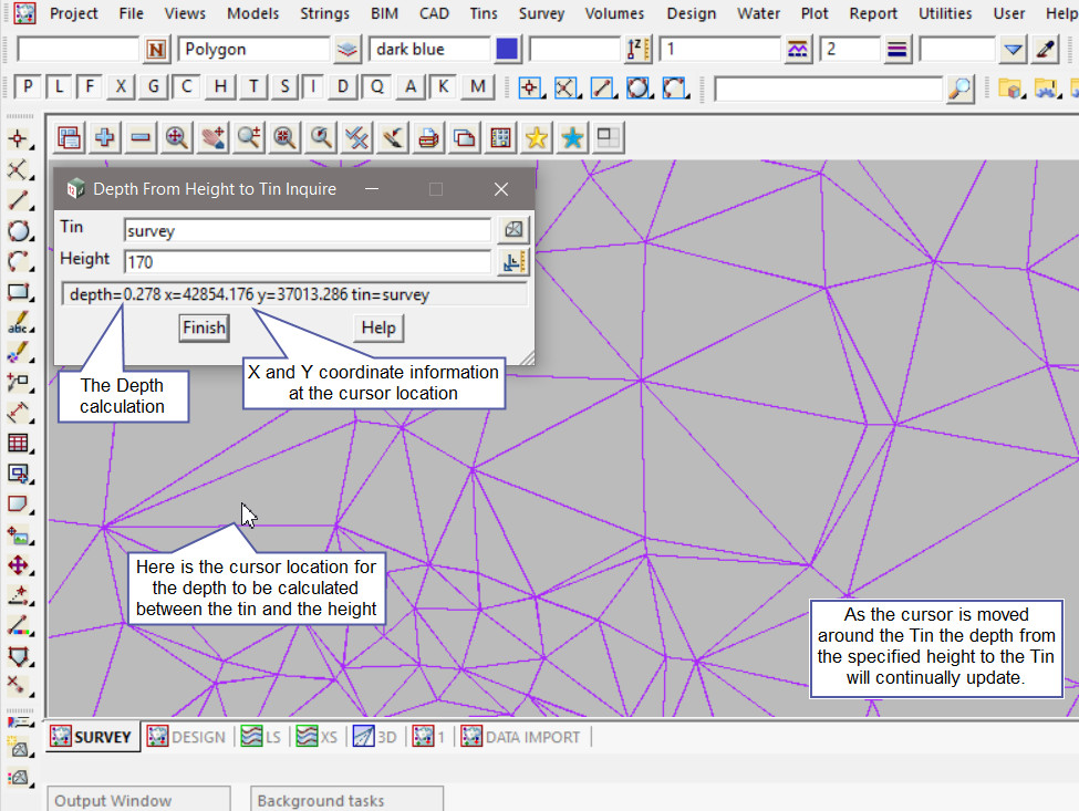 This option is used to calculate and display the difference between the z-value of a Tin and a given height in the project.